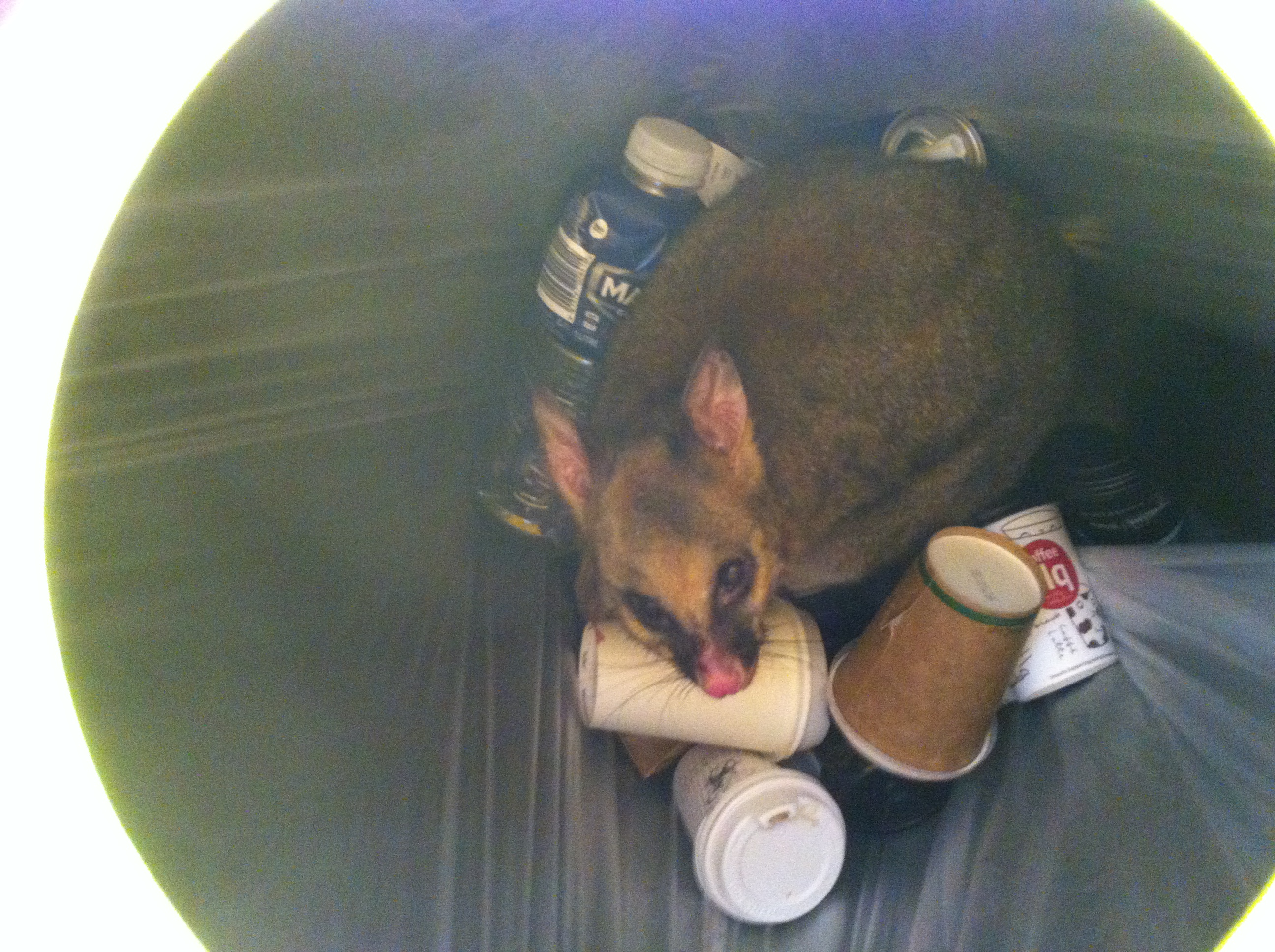 A terrible scream came from platform 2 yesterday. Some poor passenger jumped out of his skin when the possum appeared out of the rubbish bin he was using. The possum sat for a while looking disgruntled and then climbed down into the next bin. When I took its photo it was calmly chowing down on some apple cores. The wound seems to be healing nicely.